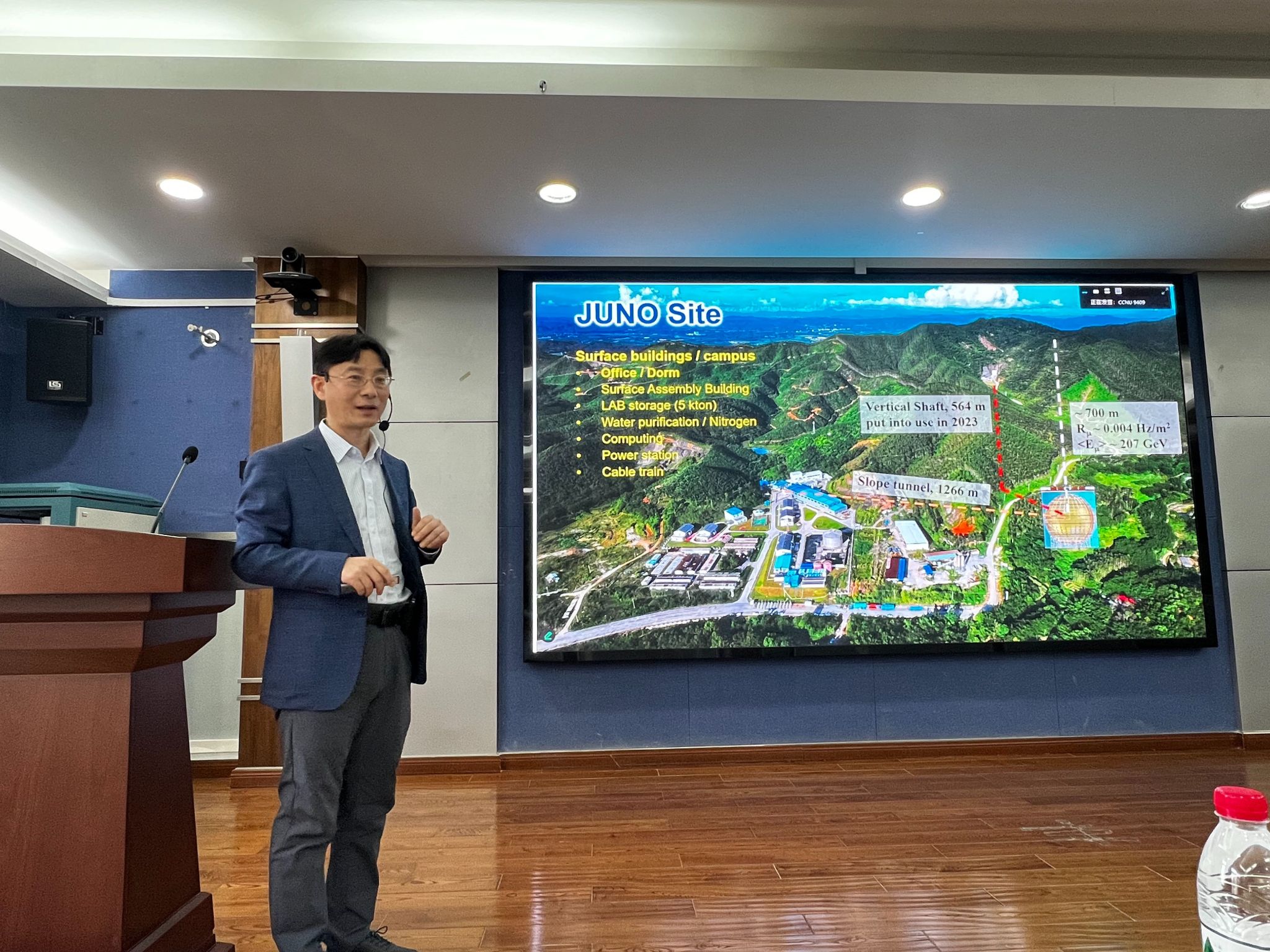 In his report, Professor Cao systematically introduced the ten-year journey of JUNO from its proposal and construction to the acquisition of the first scientific results. As the first completed and operational facility among the three major next-generation neutrino experiments worldwide, JUNO is located 700 meters underground, features a core detector of 20,000 tons of liquid scintillator, and officially began scientific data collection on August 26, 2025. Professor Cao specifically highlighted that in the initial results released on November 19, JUNO improved the measurement precision of the neutrino mixing parameters sin²θ₁₂ and Δm²₂₁ by factors of 1.5 and 1.8, respectively, setting the best measurement records in this field over the past 50 years.