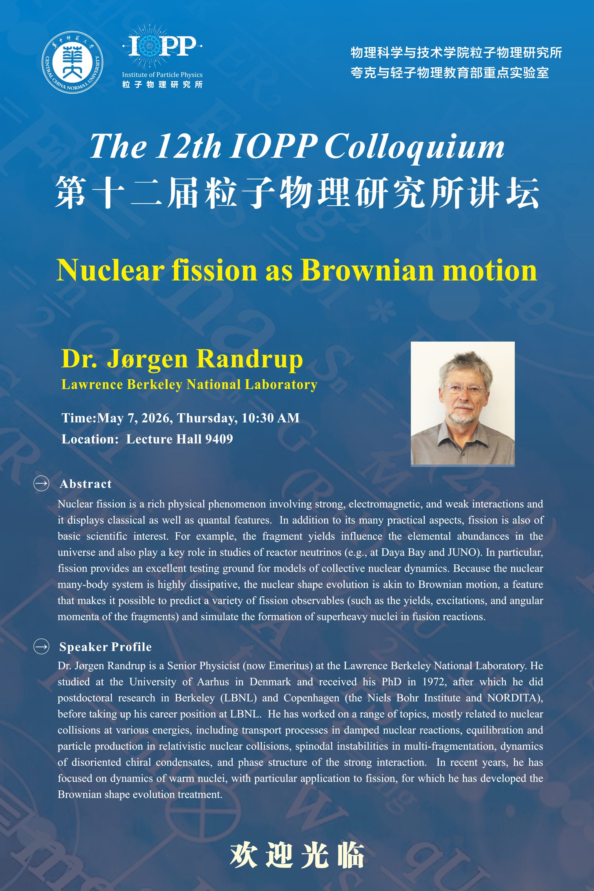 Dr. Jørgen Randrup is a Senior Physicist (now Emeritus) at the Lawrence Berkeley National Laboratory. He studied at the University of Aarhus in Denmark and received his PhD in 1972, after which he did postdoctoral research in Berkeley (LBNL) and Copenhagen (the Niels Bohr Institute and NORDITA), before taking up his career position at LBNL. He has worked on a range of topics, mostly related to nuclear collisions at various energies, including transport processes in damped nuclear reactions, equilibration and particle production in relativistic nuclear collisions, spinodal instabilities in multi-fragmentation, dynamics of disoriented chiral condensates, and phase structure of the strong interaction. In recent years, he has focused on dynamics of warm nuclei, with particular application to fission, for which he has developed the Brownian shape evolution treatment.