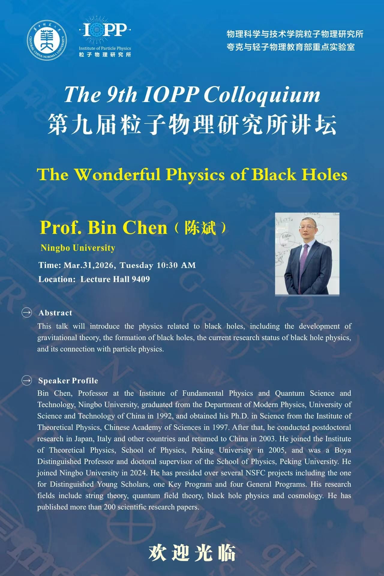 Bin Chen, Professor at the Institute of Fundamental Physics and Quantum Science and Technology, Ningbo University, graduated from the Department of Modern Physics, University of Science and Technology of China in 1992, and obtained his Ph.D. in Science from the Institute of Theoretical Physics, Chinese Academy of Sciences in 1997. After that, he conducted postdoctoral research in Japan, Italy and other countries and returned to China in 2003. He joined the Instituteof Theoretical Physics, School of Physics, Peking University in 2005, and was a Boya Distinguished Professor and doctoral supervisor of the School of Physics, Peking University. Hejoined Ningbo University in 2024. He has presided over several NSFC projects including the onefor Distinguished Young Scholars, one Key Program and four General Programs. His researchfields include string theory, quantum field theory, black hole physics and cosmology. He haspublished more than 200 scientific research papers.