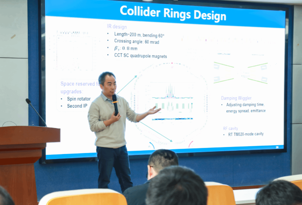 报告中,刘教授通过丰富的图表和数据展示了STCF的三大核心科学目标:强相互作用研究、对称性破缺探索,和基础参数测量。在技术进展方面,刘教授展示了STCF加速器与探测器的创新设计:加速器采用双环对撞结构和Crab-waist碰撞方案,探测器则集成了高精度径迹系统、新型粒子识别系统(如BTOF/DTOF)和电磁量能器,其动量分辨率可达0.5%@1 GeV/c,π/K识别能力在2 GeV/c时优于4σ。他还提到,STCF关键技术研发项目已于2023年启动,获3.64亿元经费支持,目前超导磁体、快时间探测器等核心部件原型已通过束流测试。