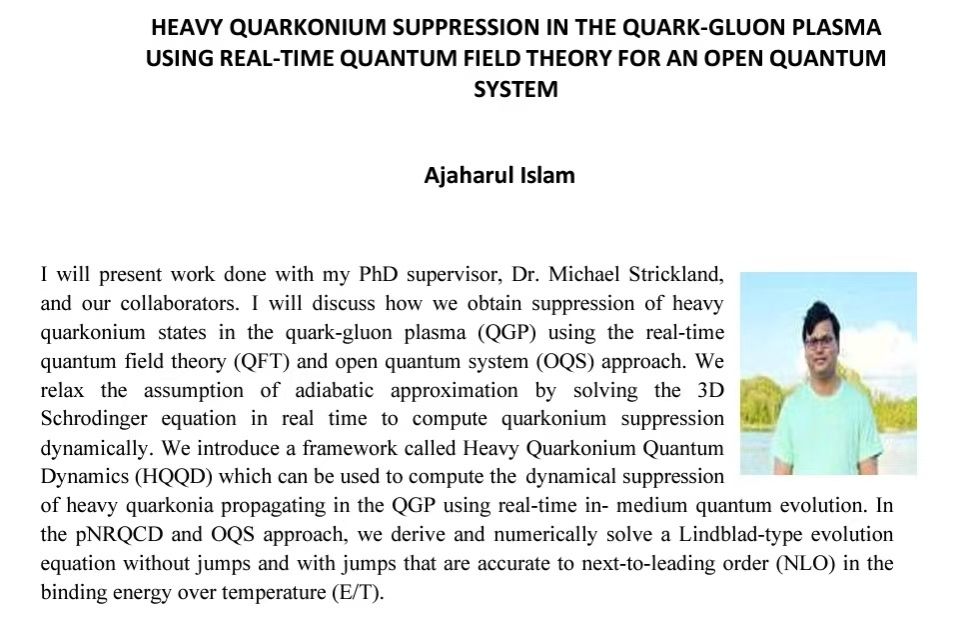 Abstract: I will present work done with my PhD supervisor, Dr. Michael Strickland, and our collaborators. I will discuss how we obtain suppression of heavy quarkonium states in the quark-gluon plasma (QGP) using the real-time quantum field theory (QFT) and open quantum system (OQS) approach. We relax the assumption of adiabatic approximation by solving the 3D Schrodinger equation in real time to compute quarkonium suppression dynamically. We introduce a framework called Heavy Quarkonium Quantum Dynamics (HQQD) which can be used to compute the dynamical suppression of heavy quarkonia propagating in the QGP using real-time in- medium quantum evolution. In the pRQCD and OQS approach, we derive and numerically solve a Lindblad-type evolution equation without jumps and with jumps that are accurate to next-to-leading order (NLO) in the binding energy over temperature (E/T).