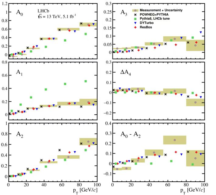 在此次的研究中,课题组分析了LHCb实验在13TeV质子-质子对撞能量下获取的大量数据,解决了探测器刻度、本底分析和效率修正等方面的一系列难题,精确测量了Z玻色子的极化参数(图1)。同时对前向区域Z玻色子的产生截面进行了迄今为止最精确的测量。这些研究成果可以帮助我们检验标准模型的一些重要理论预言,并为理解质子内部结构提供重要信息,特别是关于海夸克以及关于横动量相关的部分子分布函数的信息。