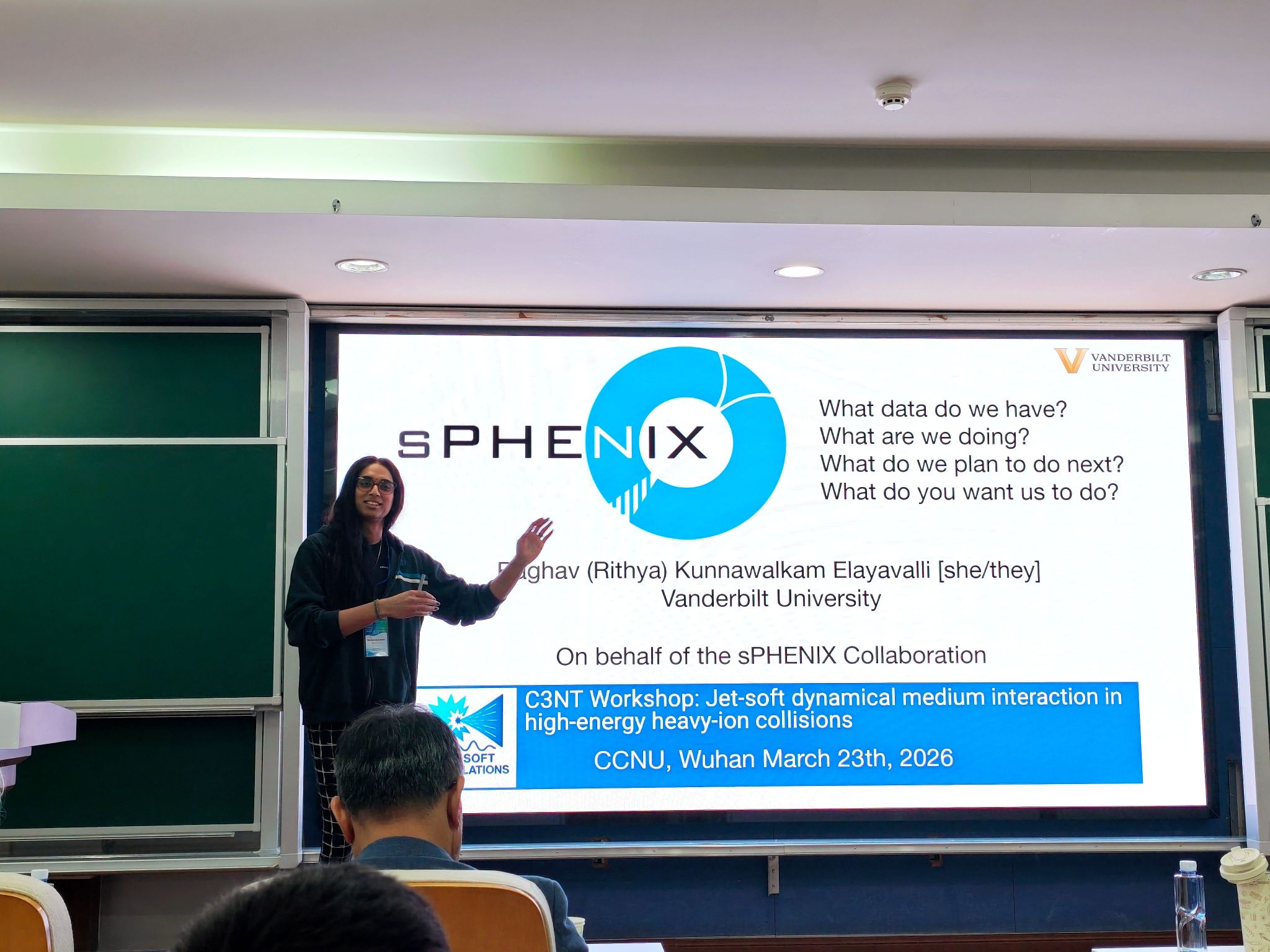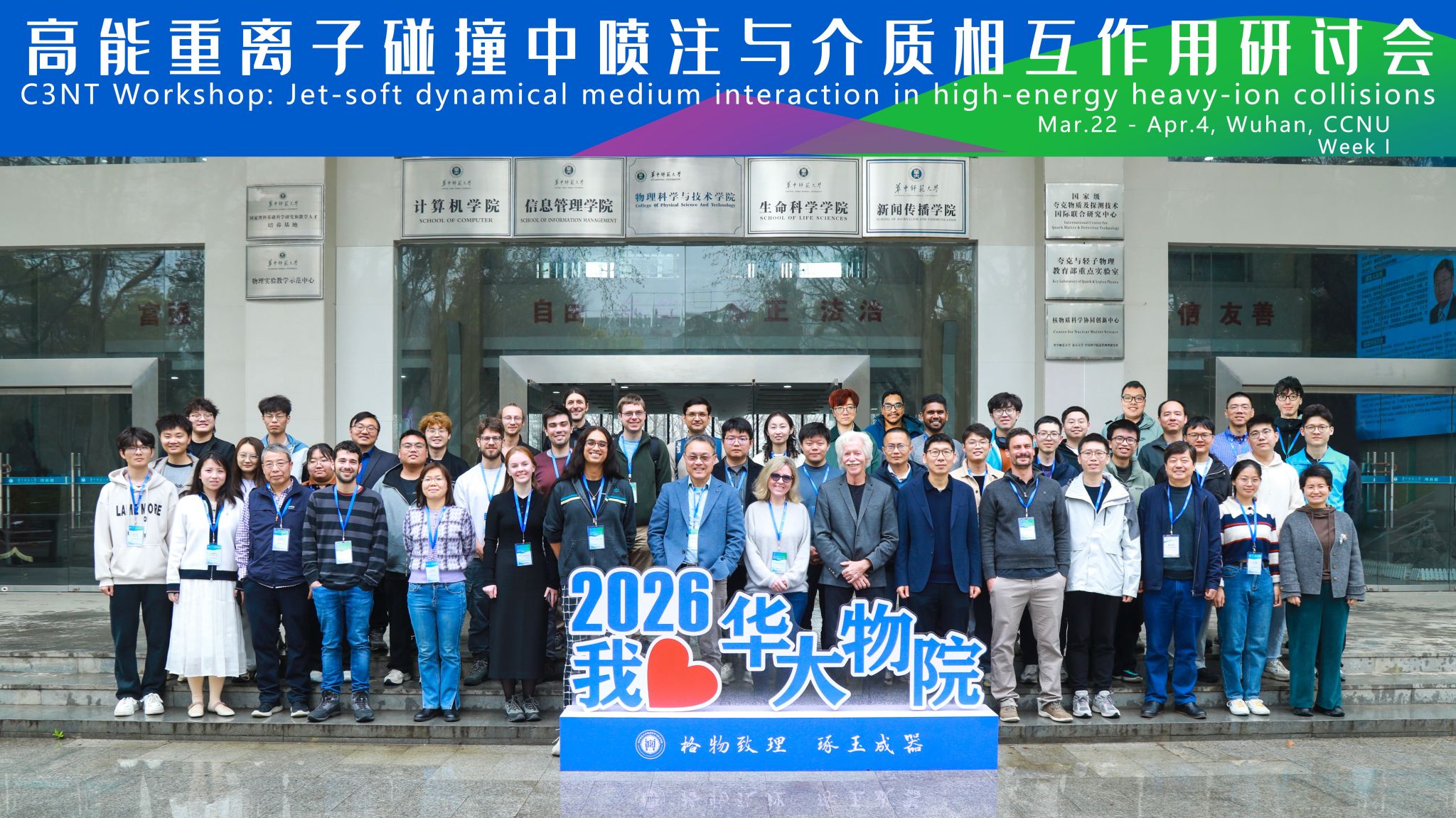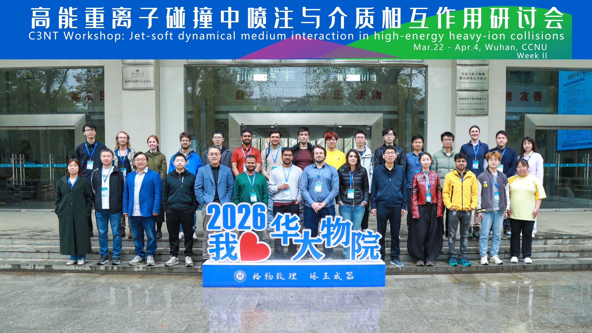 2026年3月21日至4月4日,“高能重离子碰撞中喷注与介质相互作用研讨会” (C3NT Workshop: Jet-soft dynamical medium interaction in high-energy heavy-ion collisions) 在华中师范大学粒子物理研究所(IOPP)和华中核理论中心(C3NT)成功举办。本次研讨会历时近两周,吸引了来自全球约15个国家和地区、共计50余名核物理领域的专家学者参与,共同探讨高能重离子碰撞中喷注(Jet)与夸克-胶子等离子体(QGP)介质之间复杂的动力学相互作用。