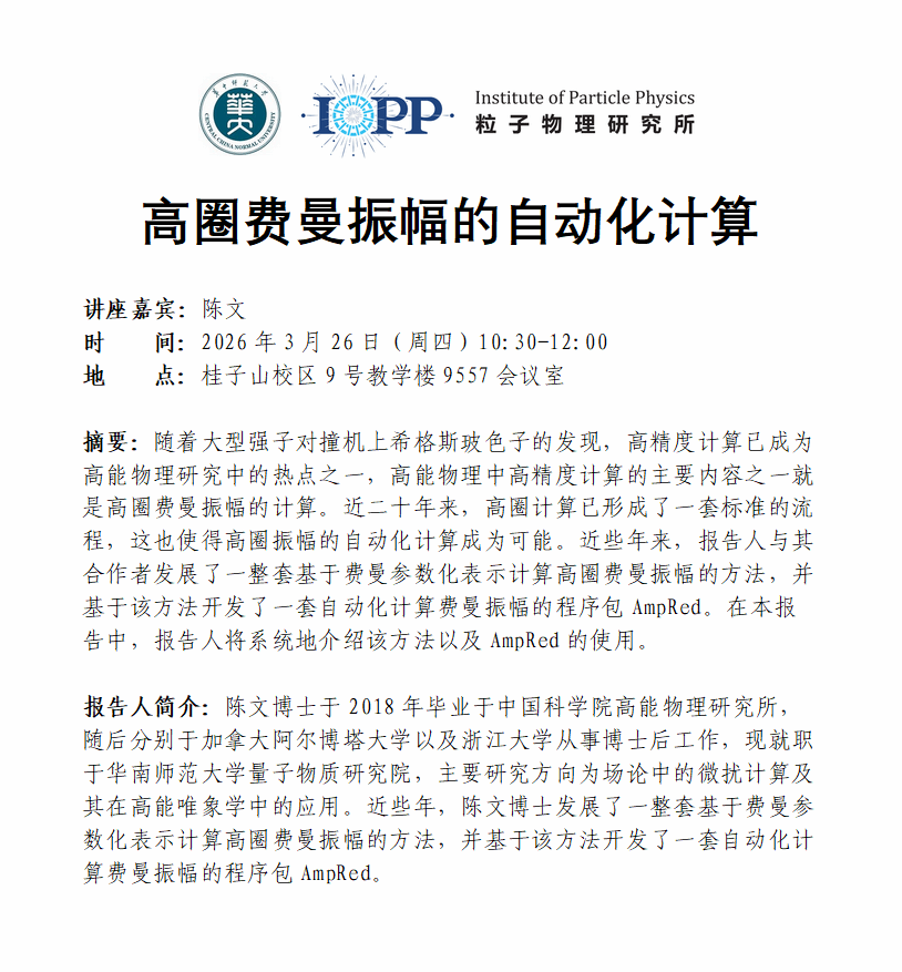陈文博士于2018年毕业于中国科学院高能物理研究所,随后分别于加拿大阿尔博塔大学以及浙江大学从事博士后工作,现就职于华南师范大学量子物质研究院,主要研究方向为场论中的微扰计算及其在高能唯象学中的应用。近些年,陈文博士发展了一整套基于费曼参数化表示计算高圈费曼振幅的方法,并基于该方法开发了一套自动化计算费曼振幅的程序包AmpRed。